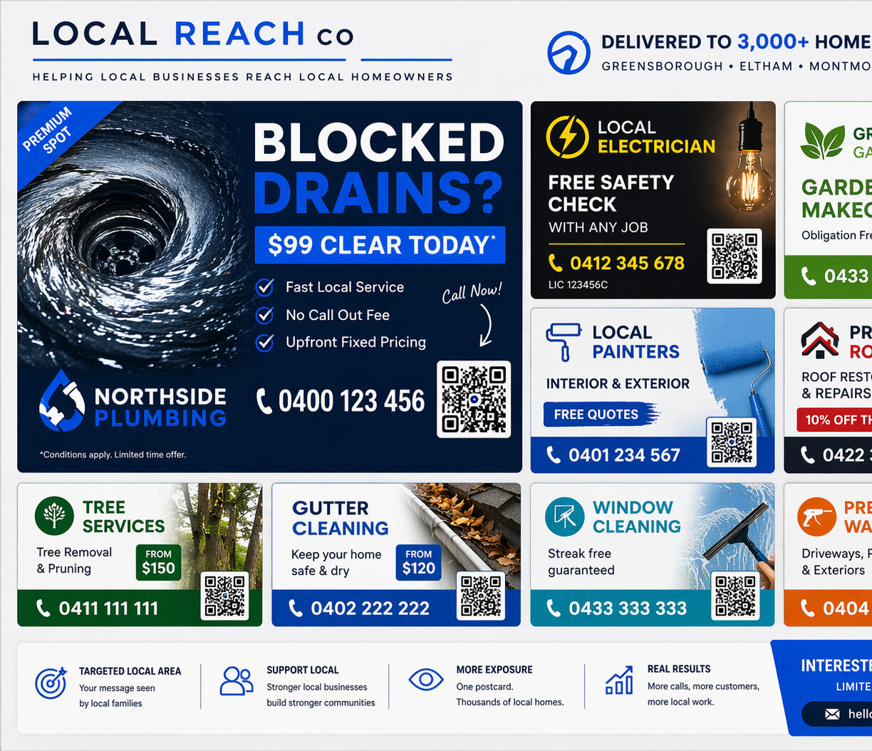 We design and deliver your business on a premium postcard to local homesOnly one business per category - no direct competition